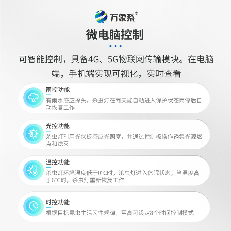 22.杀虫灯控制器:具有微电脑控制,一体化集成线路板,并可智能控制,具备4G、5G物联网传输模块。在电脑端,手机端实现可视化,实时查看。
