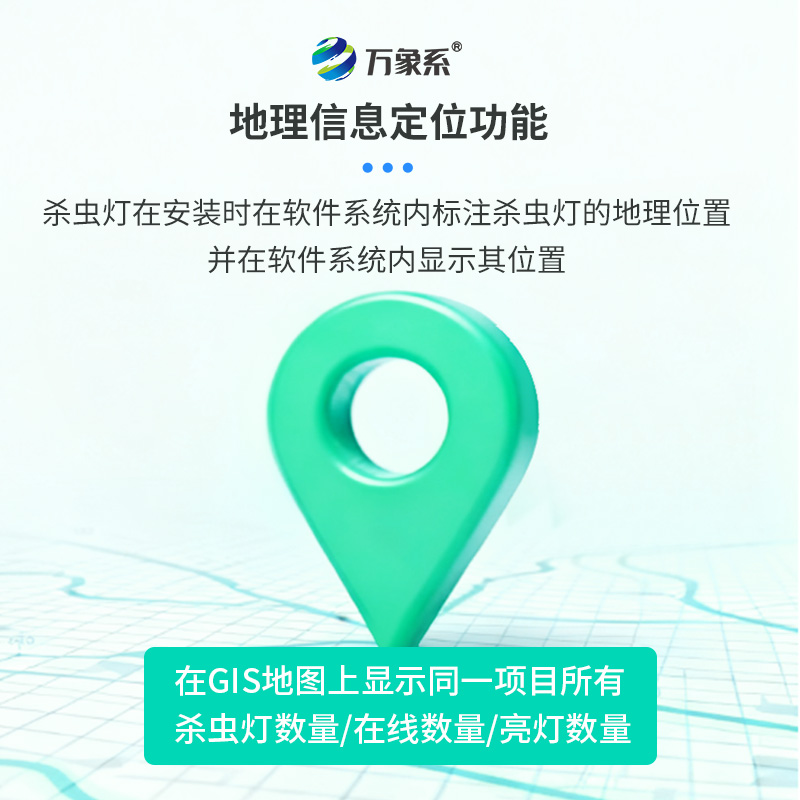 9.地理信息定位功能:杀虫灯在安装时在软件系统内标注杀虫灯的地理位置,并在软件系统内显示其位置。在GIS地图上显示同一项目所有杀虫灯数量、在线数量、亮灯数量,方便管理。